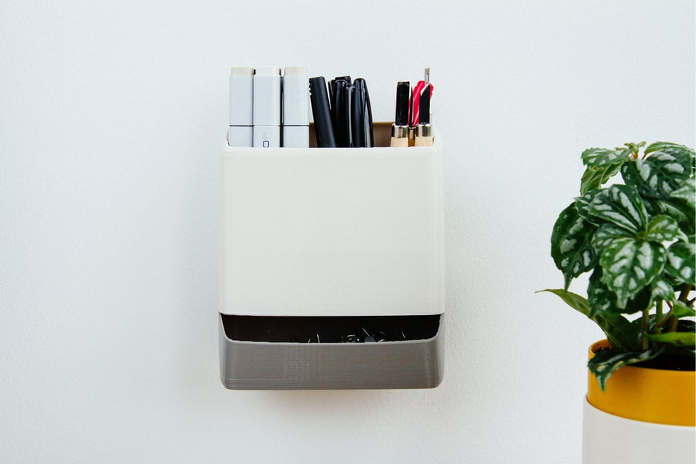 Simply print the bins and bracket, and use push-pins to affix the organizer on the wall. Perfect for containing all the pens, pencils, markers, cutters, exactos, push-pins, post-its and other miscellanea that clutters up an otherwise pristine work surface.